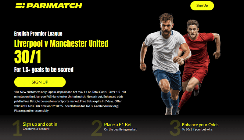 18+ New customers only. Opt in, deposit and bet max £1 on Total Goals – Over 1.5 – 90 minutes on the Liverpool VS Manchester United match. No cash out. Enhanced odds paid in Free Bets; to be used on any Sports market. Free Bets expire in 7 days. Offer valid until 16:30 UK time on 19.10.25. Scroll down for T&Cs. GambleAware.org | Please gamble responsibly.
