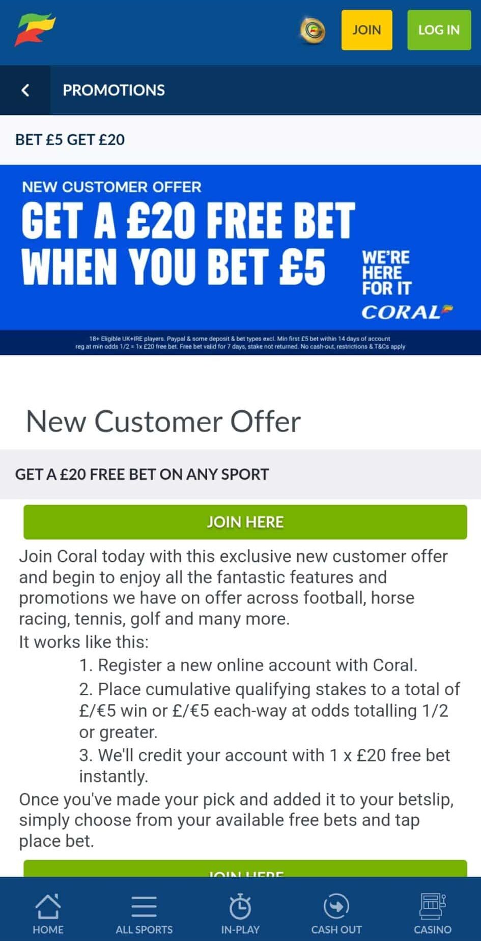 New customers can get an exclusive £20 in free bets for betting £5 with Coral.