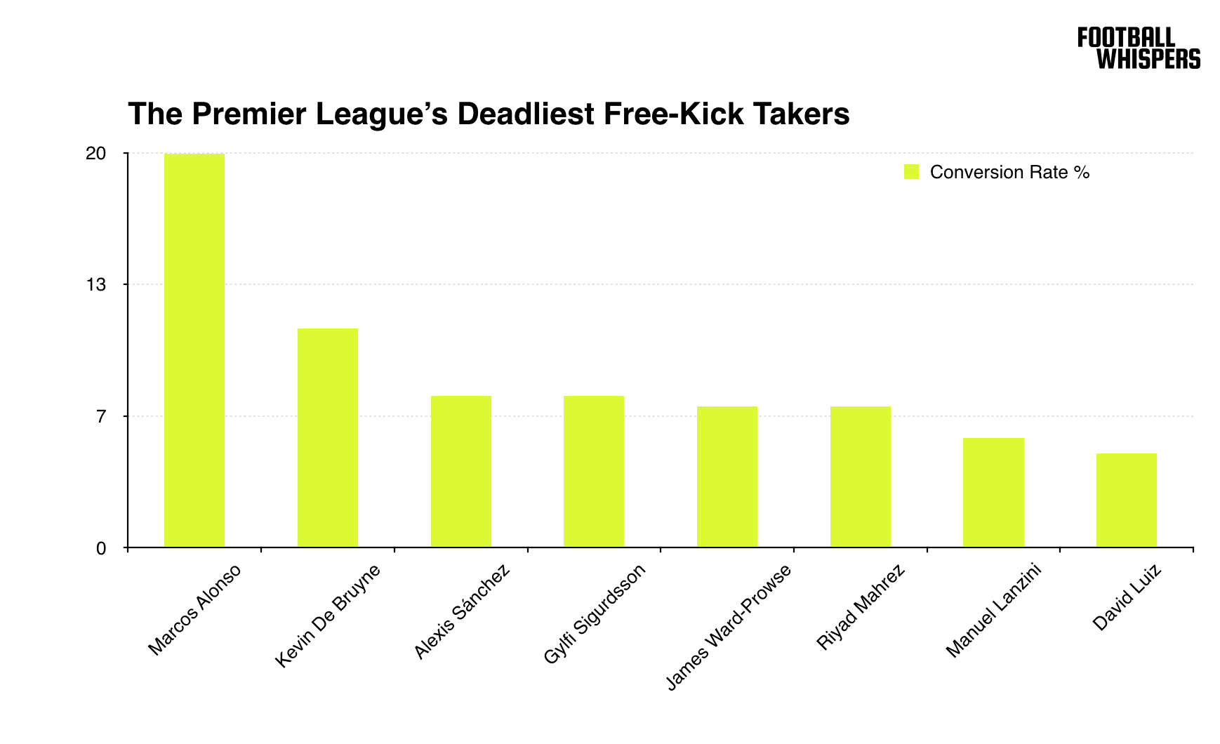 The Belgian is arguably the best midfielder in Europe but when it comes to converting free-kicks he's only second on our list.