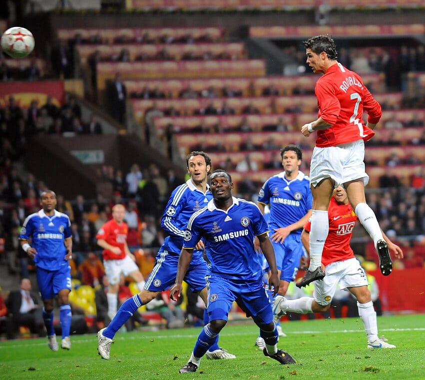Lurking with menace on Michael Essien’s blind side, Ronaldo tracked a curling Wes Brown left-footed cross before he exploded vertically into the evening air. A perfectly-timed glancing header followed, leaving Chelsea keeper Petr Cech, who was nailed to his position and helpless.