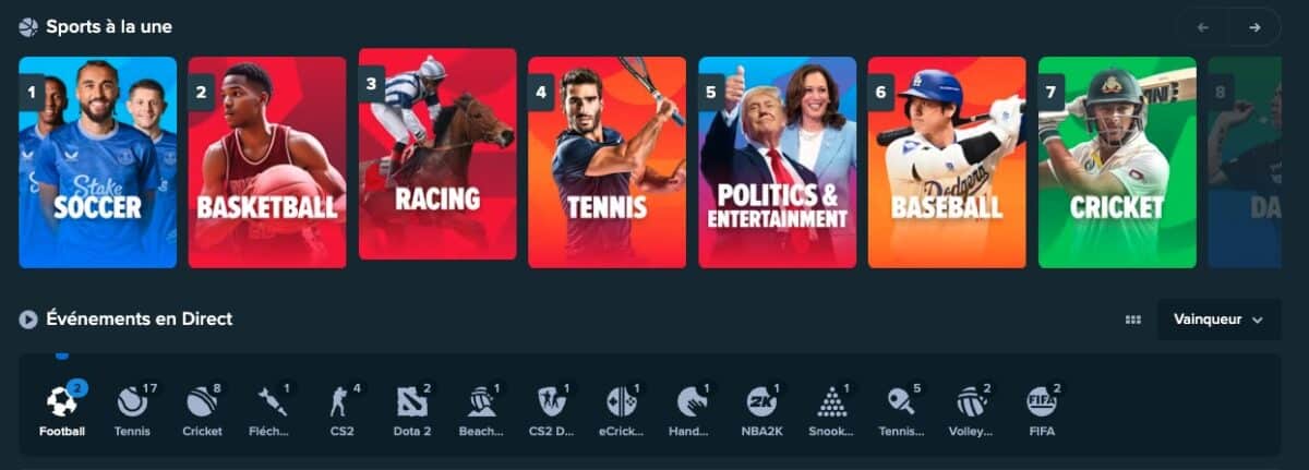 Bien qu’il n’y ait pas d’app Stake, il est possible de faire des paris sur vos appareils en déplacement. La version mobile rend cela possible. Une fois sur la page d’accueil, vous verrez un large éventail de sports sur lesquels parier. Le bookmaker propose plus de 30 disciplines, des plus populaires comme le football aux disciplines de niche comme le ski alpin.