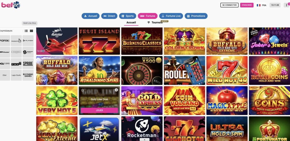 Vous retrouver les jeux de casino dans les rubriques Fortune et Fortune Live. Nous avons trouvé que la navigation est vraiment intuitive grâce aux onglets. Parmi les fournisseurs, vous avez les plus connus comme Elbet, Playson ou encore Pragmatic Play.
