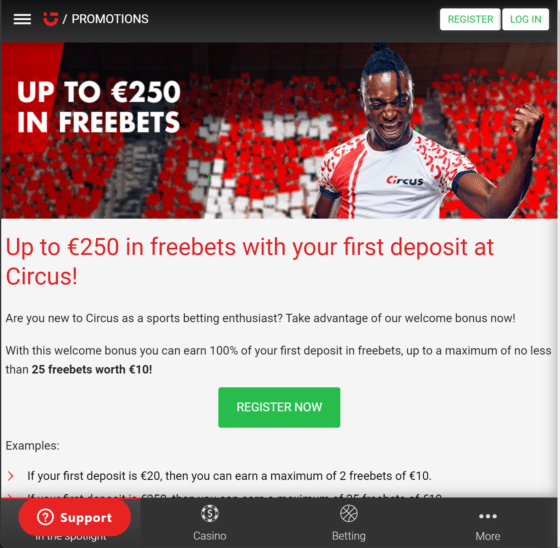 De Circus promotiecode is over het algemeen alleen bestemd voor nieuw geregistreerde spelers. Om in aanmerking te komen voor deze acties zul je jezelf wel eerst moeten registreren. Vervolgens navigeer je naar het desbetreffende casino of sportonderdeel en neem je aandachtig bepaalde bonusvoorwaarden in je op. De volgende sport en casino aanbiedingen zien er als volgt uit.